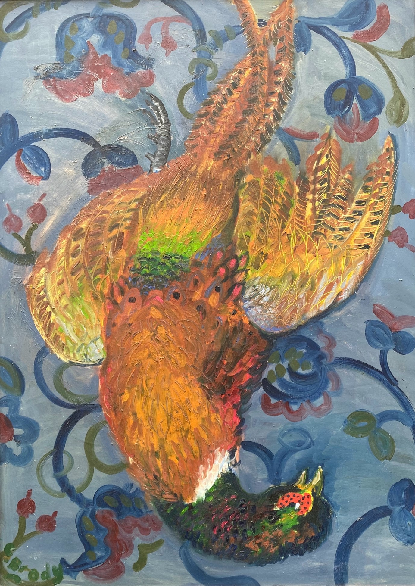 The irony in the title here is part of the story. It also celebrates the resplendence and depth of colour in this beautiful bird. The contrasting background in the fabric also speaks to the paradox.