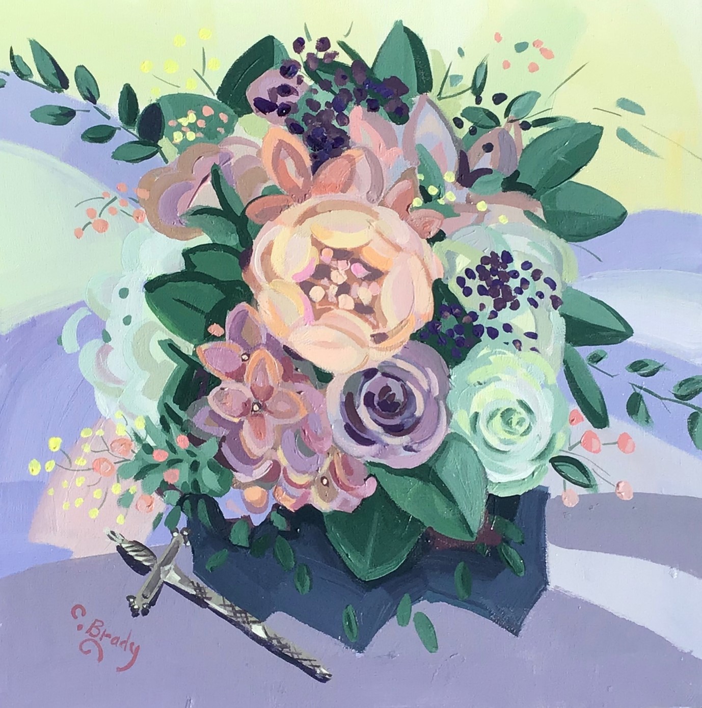 A painting of the bride’s bouquet with the groom’s lapel pin; commissioned by the bridesmaid.